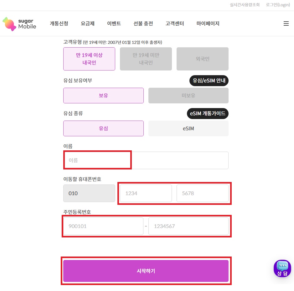 09. 이름, 연락처, 주민등록번호 입력하고 시작하기 버튼 클릭 !!