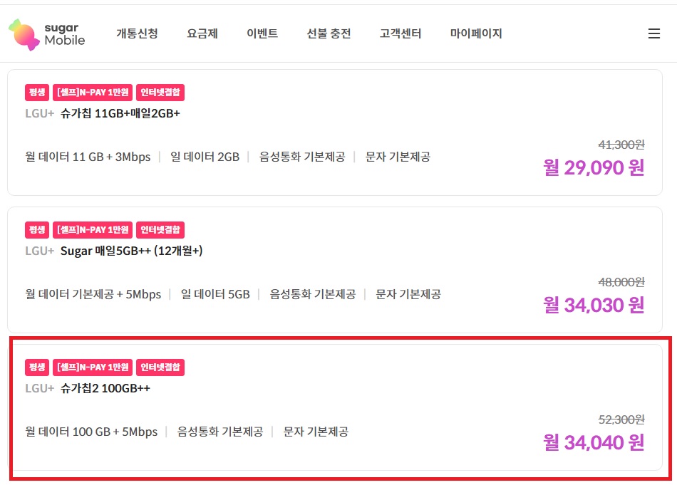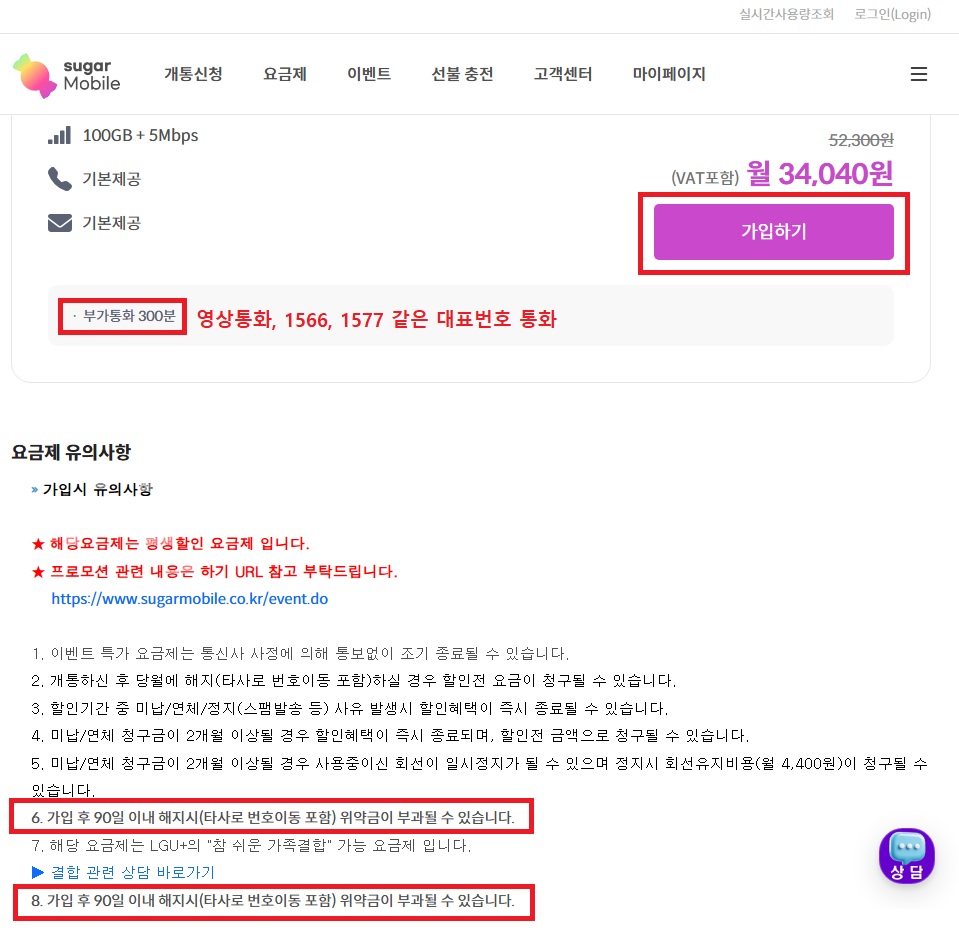 음성통화/문자 기본제공(무제한)에 월 데이터 100GB 제공, 데이터 소진시 5Mbps 속도로 사용가능한데 34,040원(부가세포함) 이라고? 빨리 가입해야지 !!