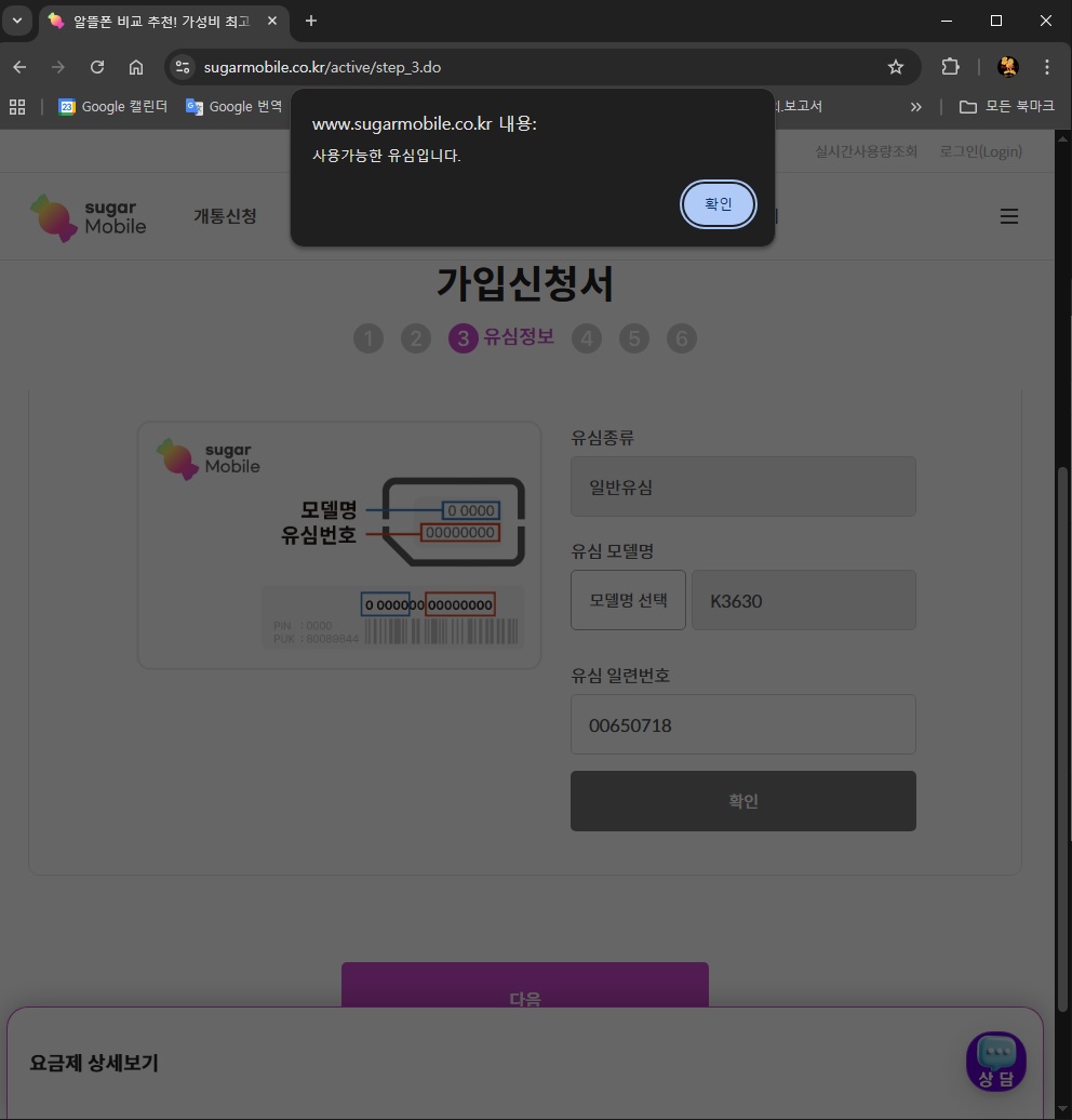 22. 사용 가능한 유심이라고 나오면 확인 클릭 !!