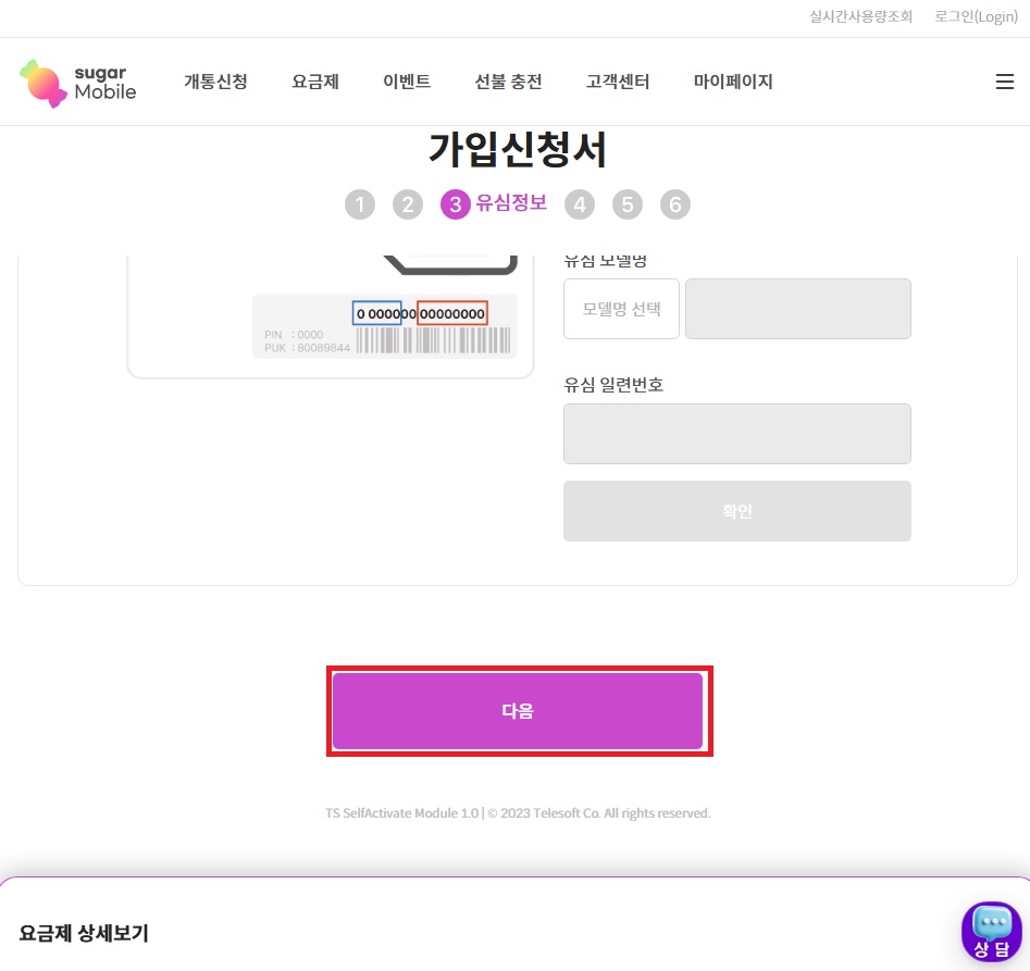 21. 유심 일련번호 입력하고 확인 클릭 !!