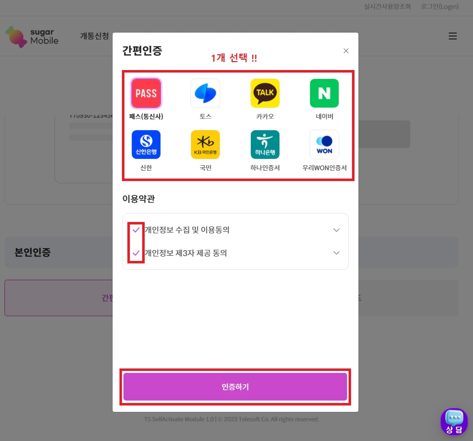 13. 인증방법 1개 선택 후, 체크박스 체크, 인증하기 순으로 클릭 !!