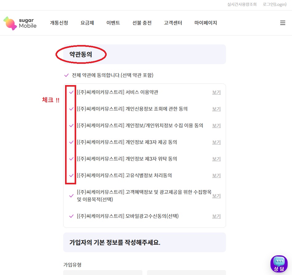 07. 약관동의는 (선택) 항목만 제외하고 체크 !!