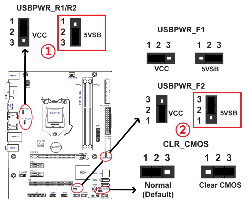 ※ 아래의 그림(붉은 색 박스)은 USB 포트에 항상 5V 전압 상태로 대기하도록 설정하는 방법입니다.
